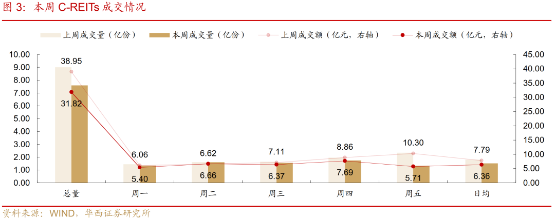 本周REITs成交活跃度边际走弱,日均成交额6.36亿元、日均成交量1.52亿份、日均换手率0.54%,环比分别下降18.30%、15.73%、0.11pct。