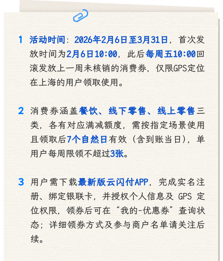 本次活动覆盖2026年新春假期前后及节后焕新旺季(2月6日—3月31日),活动期间,每周五10点开始领券,单用户每周限领取单品类票券1张(零售券线上线下分开计算),不可交叉混用。票券自领取后7个自然日有效(含到账当日)。每周最高领取不超过3张,仅限GPS定位在上海的用户领取使用。