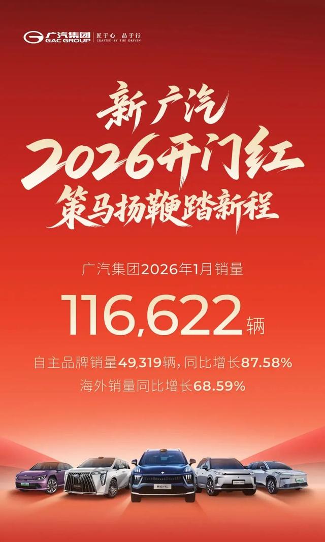 2026年首月,广汽集团销量录得“开门红”,集团整体销量为116622辆,同比增长18.47%。其中自主品牌销量49319辆,同比增长87.58%,海外销量同比增长68.59%。