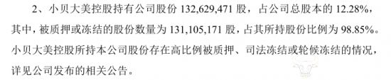而小贝大美控股持有公司股份13262.9471万股,占公司总股本的12.28%,其中,被质押或冻结的股份数量为13110.5171万股,占其所持股份的比例高达98.85%,几乎全被质押或冻结。