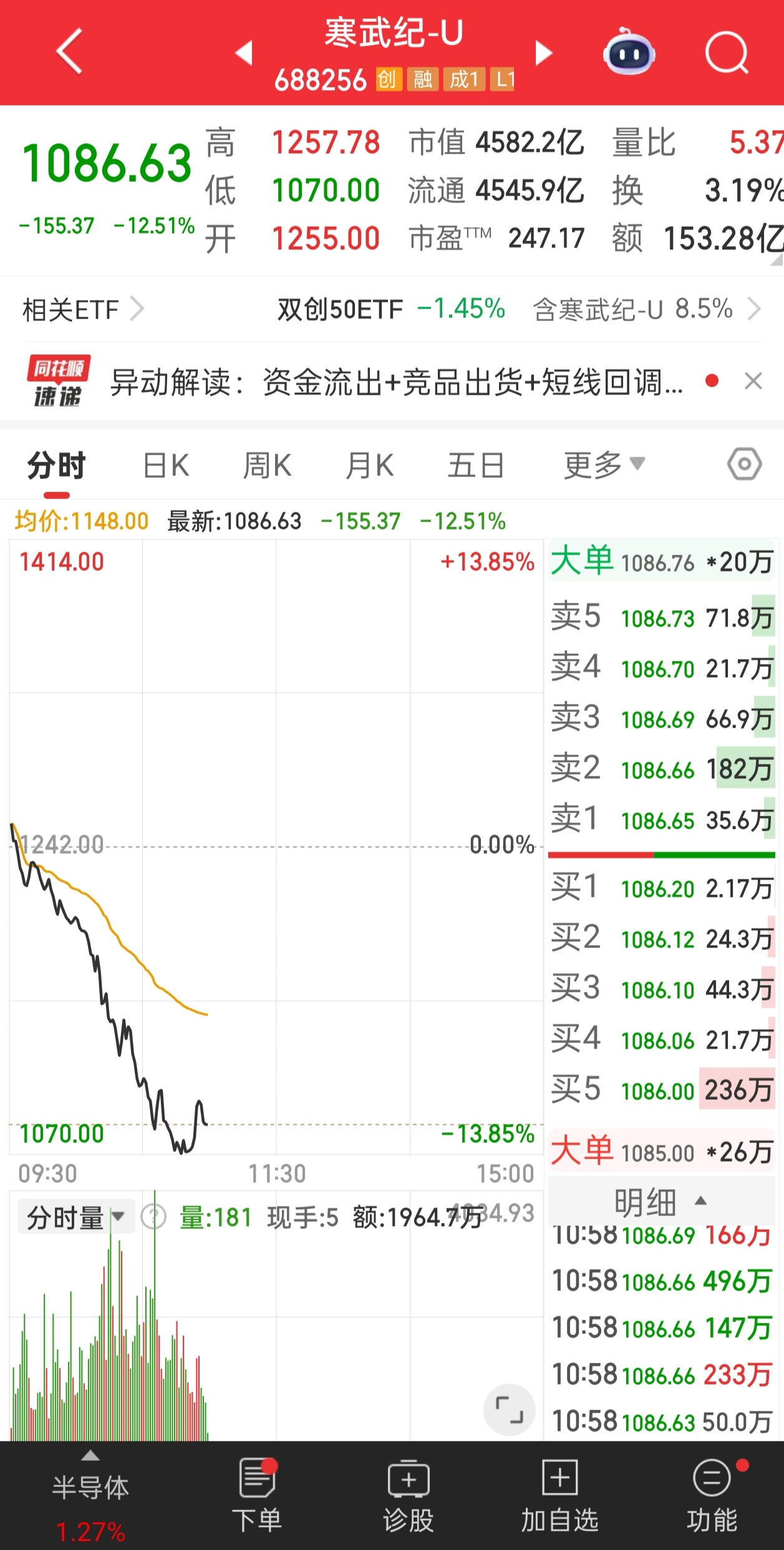 截至发稿,寒武纪股价下跌12.51%,报1086.63元/股,市值滑落至4582.2亿元。