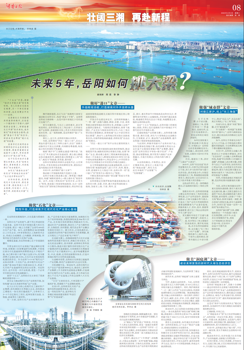 从“洞庭鱼米乡”到“长江经济带战略支点”,岳阳的每一次定位升级,都是一次格局重塑。四篇文章,既是路径,也是底气;现代石化新材料、绿色智能计算、港航物流三大产业集群的培育,更为发展持续注入活力。