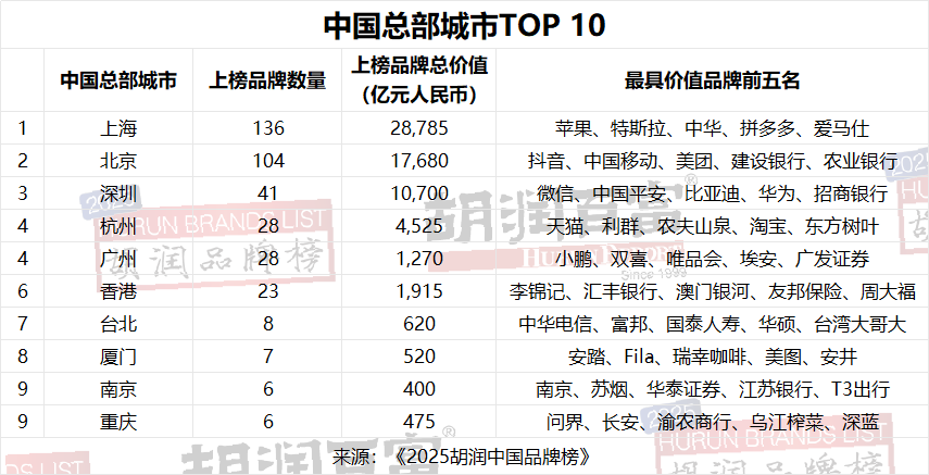中国总榜城市方面,上海是最多上榜品牌设立中国总部的城市,有136个,其次是北京104个,深圳41个,杭州和广州各有28个,香港23个,前六城市贡献了榜单超七成的品牌数量。