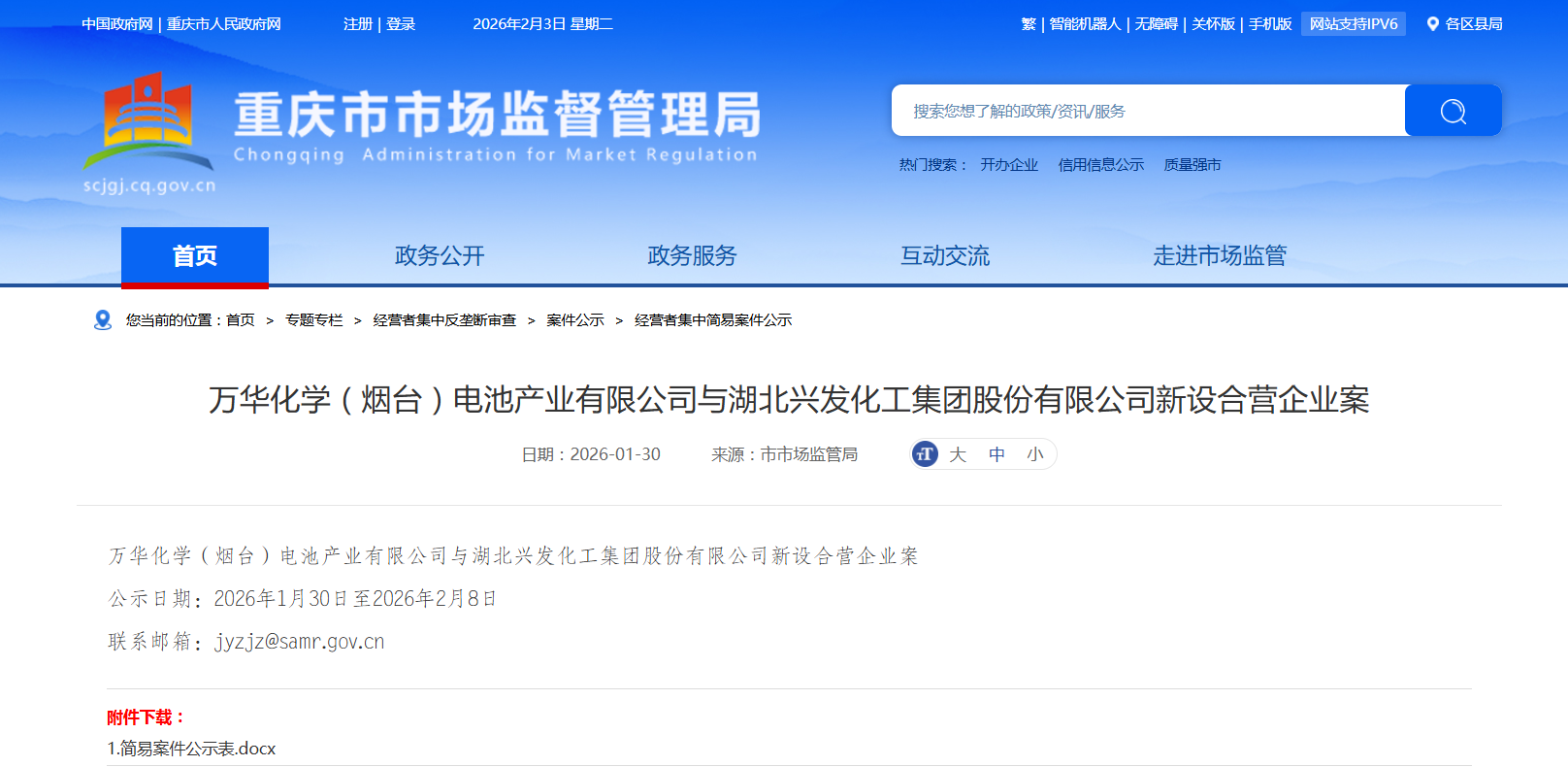 万华化学(烟台)电池产业有限公司与湖北兴发化工集团股份有限公司新设合营企业案