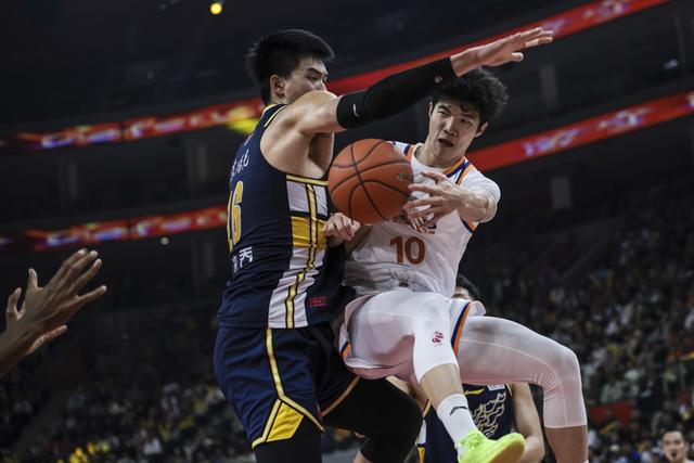 新华社照片,东莞(广东),2026年2月3日 2月3日,上海久事队球员王哲林(右)上篮受阻。 2月3日,在2025-2026赛季中国男子篮球职业联赛(CBA)第23轮比赛中,广东东阳光队主场84比94不敌上海久事队。 新华社发(郑家雄摄)