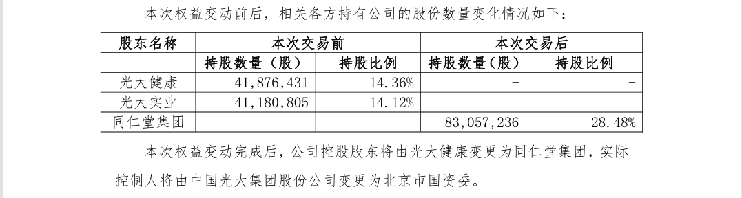 公告显示,此次股份转让价格为人民币17.59元/股,转让价款总计为人民币14.6亿元。其中,光大健康将其持有的公司41876431股股份(占公司总股本的14.36%)转让给同仁堂集团,转让价款为人民币736606421.29元;光大实业将其持有的公司41180805股股份(占公司总股本的14.12%)转让给同仁堂集团,转让价款为人民币724370359.95元。