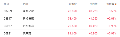 截至收盘,康龙化成(03759.HK)涨3.58%、泰格医药(03347.HK)涨2.01%、昭衍新药(06127.HK)涨1.90%。
