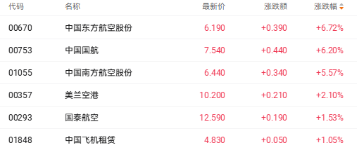 截至收盘,中国东方航空股份(00670.HK)涨6.72%、中国国航(00753.HK)涨6.20%、中国南方航空股份(01055.HK)涨5.57%。
