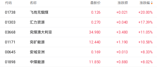 截至收盘,飞尚无烟煤(01738.HK)涨20%、兖煤澳大利亚(03668.HK)涨11.05%、兖矿能源(01171.HK)涨10.58%。
