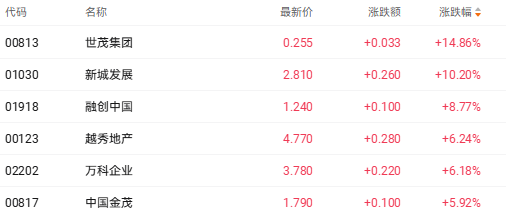 截至收盘,世茂集团(00813.HK)涨14.86%、新城发展(01030.HK)涨10.20%、融创中国(01918.HK)涨8.77%。