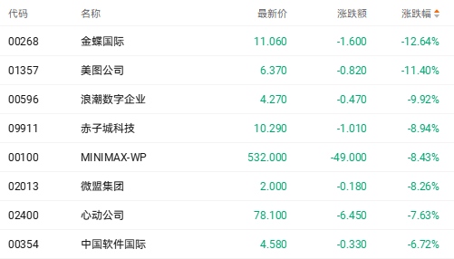截至收盘,金蝶国际(00268.HK)跌12.64%、微盟集团(02013.HK)跌8.26%、中国软件国际(00354.HK)跌6.72%。