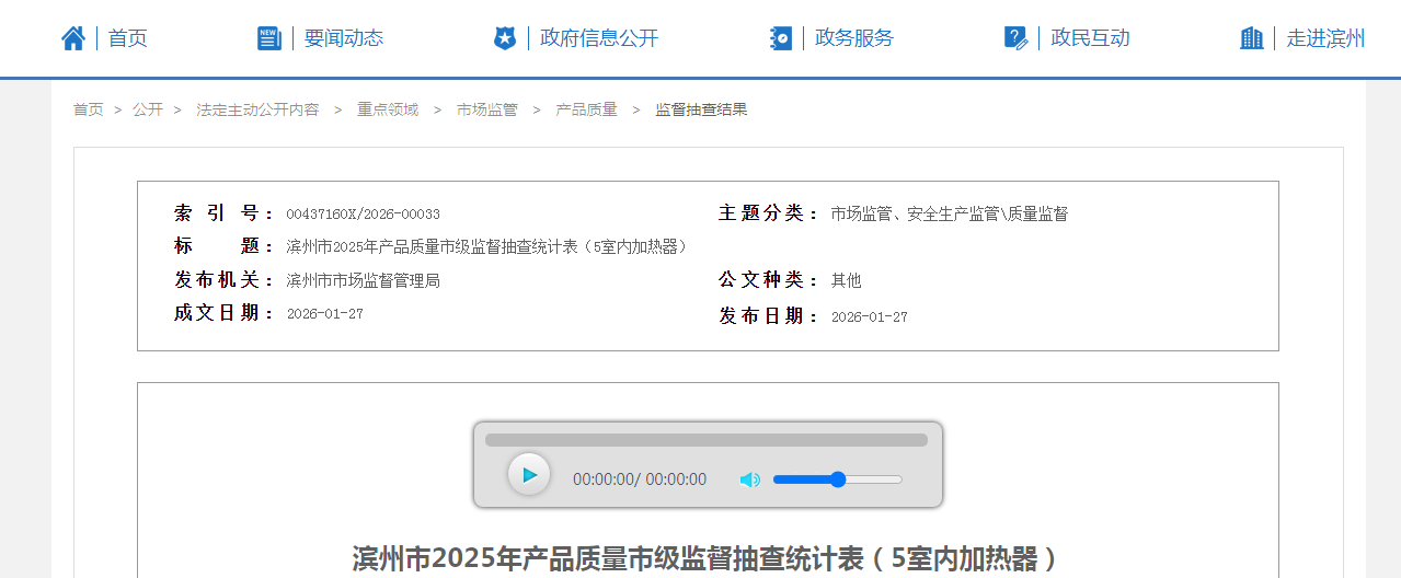 中国质量新闻网讯 据山东省滨州市人民政府网站消息,近日,滨州市市场监督管理局发布2025年产品质量市级监督抽查统计表(5室内加热器)。