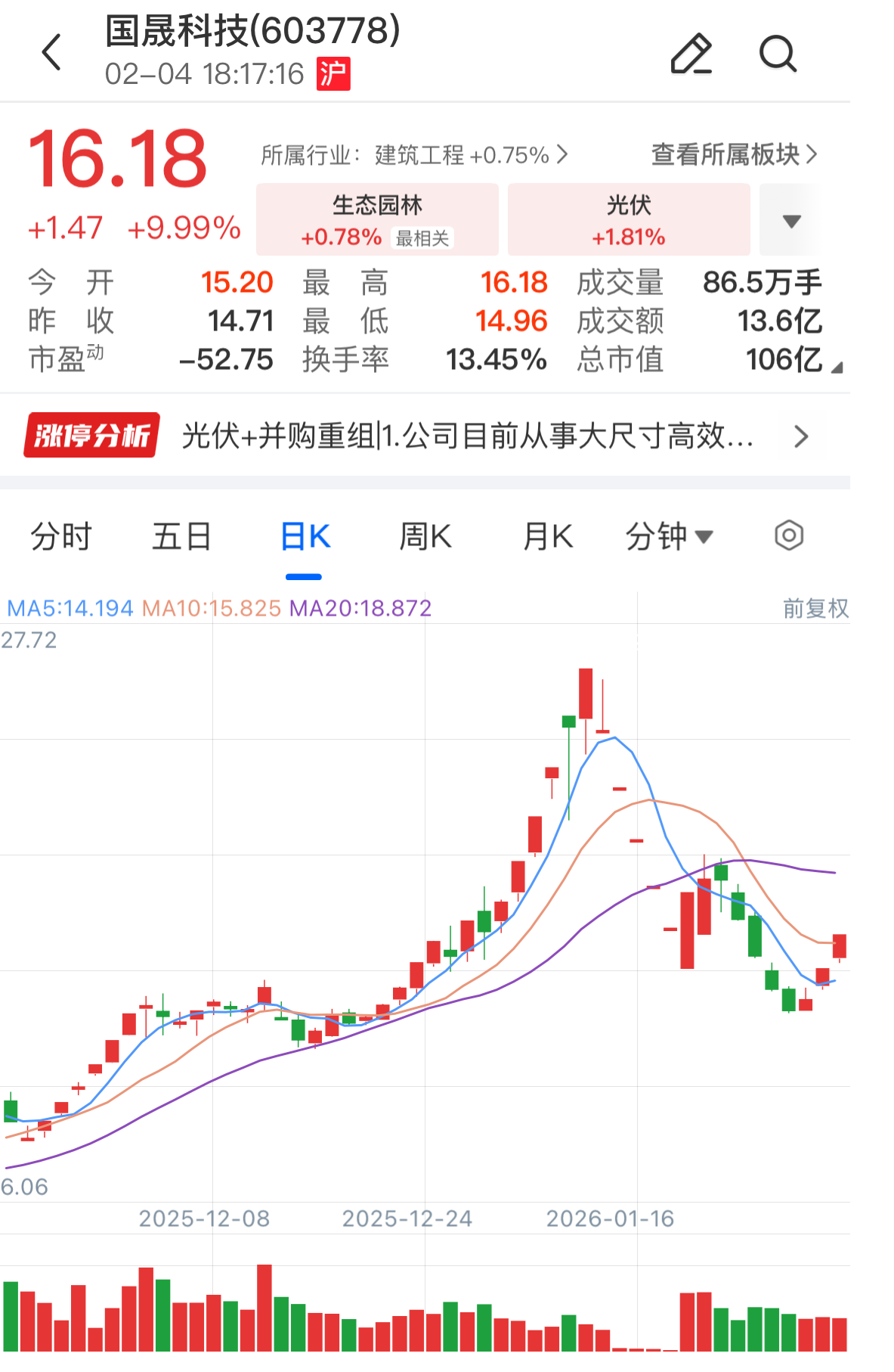 国晟科技是近年来A股市场少见的大牛股。2025年,该股股价涨幅达到480.86%;2026年1月月中展开大幅调整,股价一度接近腰斩,截至今日收盘,该股录得2连板,收盘价报16.18元/股。
