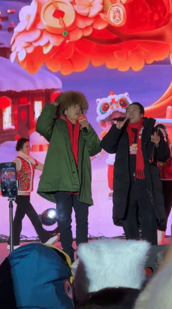 夜幕降临后,本次嗨摇夜的核心晚会环节正式上演。长春冰雪新天地灯光璀璨,冰雕建筑与舞台光影交相辉映,十二组艺人与快手达人轮番登台献艺。全民健身教练刘畊宏现场带领全场观众燃动健身,在冰雪中传递健康活力;R.E.D组合带来潮流歌舞表演,实现传统年味与流行文化的跨界碰撞;歌手那艺娜以感染力歌声拉满现场欢乐氛围;唐山泡泡龙家族化身“财神”送福,东北艺人何玉用本土乡音唱响经典曲目,浓郁东北风情引爆全场共鸣。歌舞、互动、祈福环节层层递进,用视听盛宴点燃寒夜,让新春祝福在冰雪间传递。