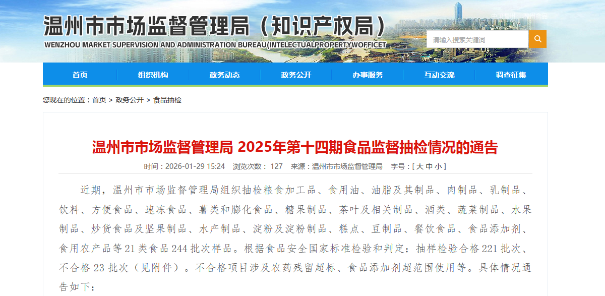 对抽检中发现的不合格产品,我局已责成相关县级市场监管部门依法予以查处。要求永嘉等地市场监管部门督促食品生产企业查清产品流向、召回不合格产品、分析原因进行整改;要求瓯海、龙港等地市场监管部门督促食品经营环节有关单位立即采取下架等措施控制风险。以上县级监管部门自通告发布之日起7日内向社会公布风险防控措施,3个月内向温州市市场监督管理局报告核查处置情况并向社会公布。特此通告。