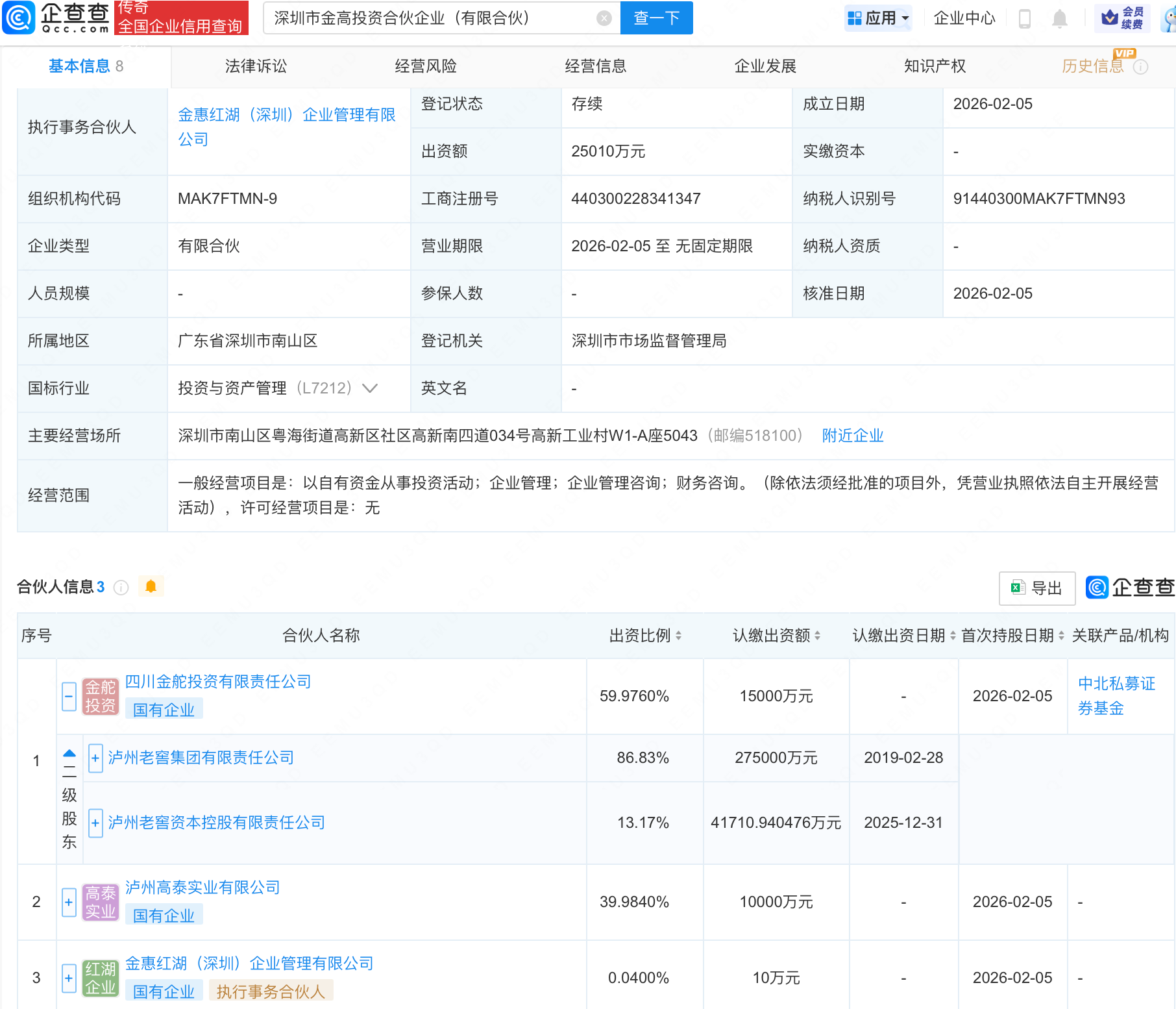 企查查APP显示,近日,深圳市金高投资合伙企业(有限合伙)成立,出资额2.5亿元,经营范围包含:以自有资金从事投资活动;企业管理;企业管理咨询;财务咨询。企查查股权穿透显示,该企业由泸州老窖(000568.SZ)旗下四川金舵投资有限责任公司等共同出资。