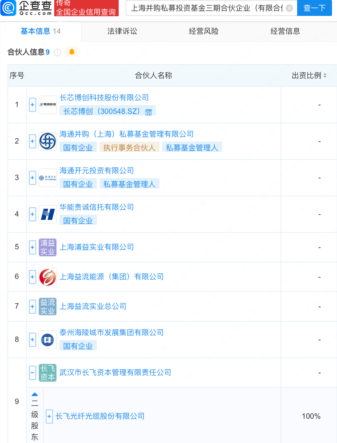 企查查APP显示,近日,上海并购私募投资基金三期合伙企业(有限合伙)成立,出资额8.3亿元,经营范围包含:以私募基金从事股权投资、投资管理、资产管理等活动。企查查股权穿透显示,该企业由长芯博创(300548.SZ)、长飞光纤(601869.SH)全资子公司武汉市长飞资本管理有限责任公司等共同出资。