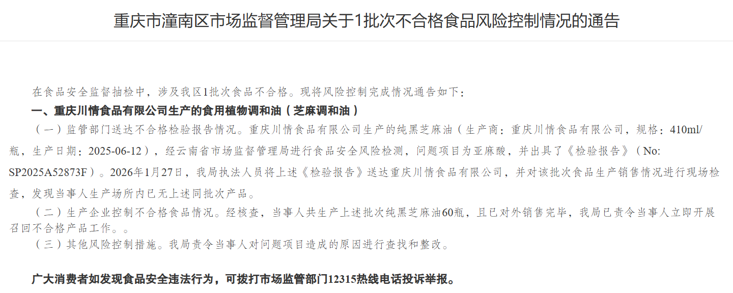 (一)监管部门送达不合格检验报告情况。重庆川情食品有限公司生产的纯黑芝麻油(生产商:重庆川情食品有限公司,规格:410ml/瓶,生产日期:2025-06-12),经云南省市场监督管理局进行食品安全风险检测,问题项目为亚麻酸,并出具了《检验报告》(No: SP2025A52873F)。2026年1月27日,我局执法人员将上述《检验报告》送达重庆川情食品有限公司,并对该批次食品生产销售情况进行现场检查,发现当事人生产场所内已无上述同批次产品。
