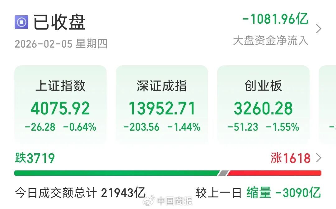 中国商报(记者 马文博)2月5日,A股三大指数集体下跌。截至收盘,沪指跌0.64%,深成指跌1.44%,创业板指跌1.55%,北证50指数跌2.03%。沪深京三市成交21943亿元,较上一日缩量3090亿元,三市超3700只个股下跌。