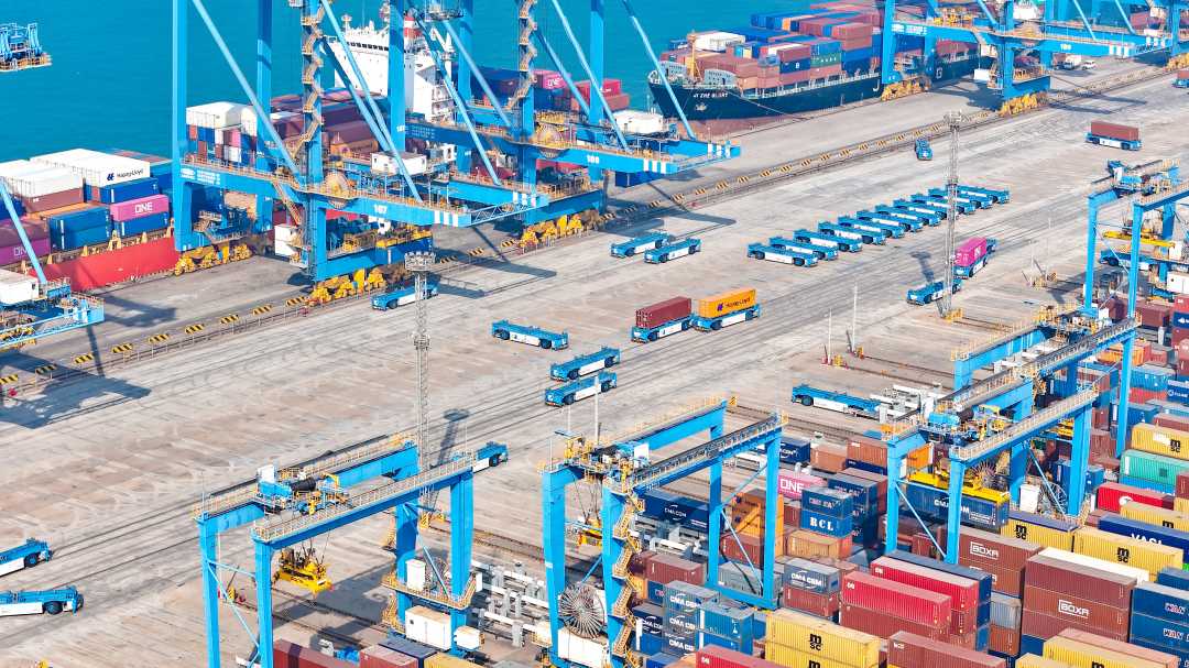 2月4日,山东港口青岛港全自动化码头,自动导引车运转有序。