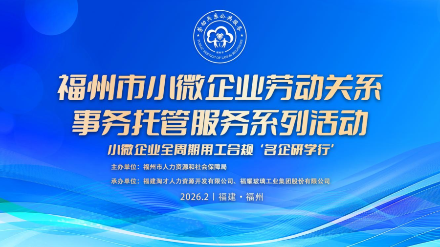 为助力福州市小微企业构建和谐劳动关系,进一步优化营商环境,2026年2月3日,由福州市人力资源和社会保障局主办,福建淘才人力资源开发有限公司、福耀玻璃工业集团股份有限公司共同承办的福州市小微企业劳动关系事务托管服务系列活动——“名企研学行”在福耀集团总部圆满举行。活动通过“生产观摩——经验分享——互动答疑”的沉浸式研学模式,为50余家小微企业负责人及人力资源管理者提供了一场“干货满满”的合规用工实践课。