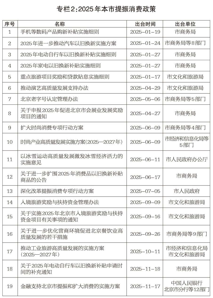 多措并举提振消费。落实深化改革提振消费专项行动方案,研究制定城乡居民增收政策,优化以旧换新政策实施机制,创新服务消费、数字消费,推动文商旅体展融合丰富消费供给,科技文化和场景创新赋能消费体验升级。(1)打造大运河、“两园一河”、南中轴、奥林匹克中心区等城市活力新片区。推动永定河右岸湿地“大地艺术”等标志性项目与首钢园“会展小镇”亮相;加力推进南中轴博物馆群一期共享序厅、文博合院项目,推动重大文化设施集群发展;开展大运河主题音乐节、水上赛事等特色活动,创作水景演艺项目,打造“滨水活力岸线”;开展奥林匹克塔和国家体育场地下环隧设计改造。(2)深入推进国际赛事名城建设,筹办世界田径锦标赛、跳水世界杯总决赛、世界女排联赛、世界乒联中国大满贯等国际赛事,举办“三大球”公开赛等青少年赛事和北京马拉松、乒乓球社区联赛、社区杯足球赛等群众体育活动。打造电竞产业集聚空间,持续实施网络游戏出版精品工程,办好全国电子体育大赛等赛事。鼓励在京首演、巡演首站落地北京;提升北京时装周、中国国际时装周品质,办好北京车展;“一场一策”提升会展场馆效能,引进高能级展会。发挥经营主体作用,提升各类活动组织的市场化和专业化水平,升级“票根+”模式、做强“超现场”新型业态,延伸大型活动消费供给链条。(3)做精“北京礼物”,提升“漫步北京”“北京微度假”“北京网红打卡地”“京彩非遗游”等品牌影响力,开发银发旅游、时尚旅游和潮玩、亲子研学等优质文旅产品,培育一批乡村旅游驿站、精品民宿,打造“来京必去”产业公园、52条旅游休闲绿道和一批冰雪旅游高质量目的地,推动怀柔雁栖湖、延庆世园公园创建国家级旅游度假区,建设大兴国际旅游度假区,推动环球影城一期剩余项目建设。出台促进住宿业高质量发展若干措施。(4)办好入境旅游发展大会,深化北京文旅全球推广体系建设,增强国际航空枢纽辐射能力,持续优化涉外服务和国际化环境。打造“食住行游购娱”一站式入境综合应用服务平台。(5)强化国潮动漫影视IP与文博场馆、非遗机构等资源联动,打造沉浸式消费空间。补齐社区、特色街区便民服务短板,扩围升级一刻钟便民生活圈,建设宜居宜业、宜游宜购、宜老宜小全龄友好型品质生活圈。(6)优化商业载体布局,提升传统商圈综合品质,推动“老字号”焕发新活力,培育特色小店,增添城市烟火气。