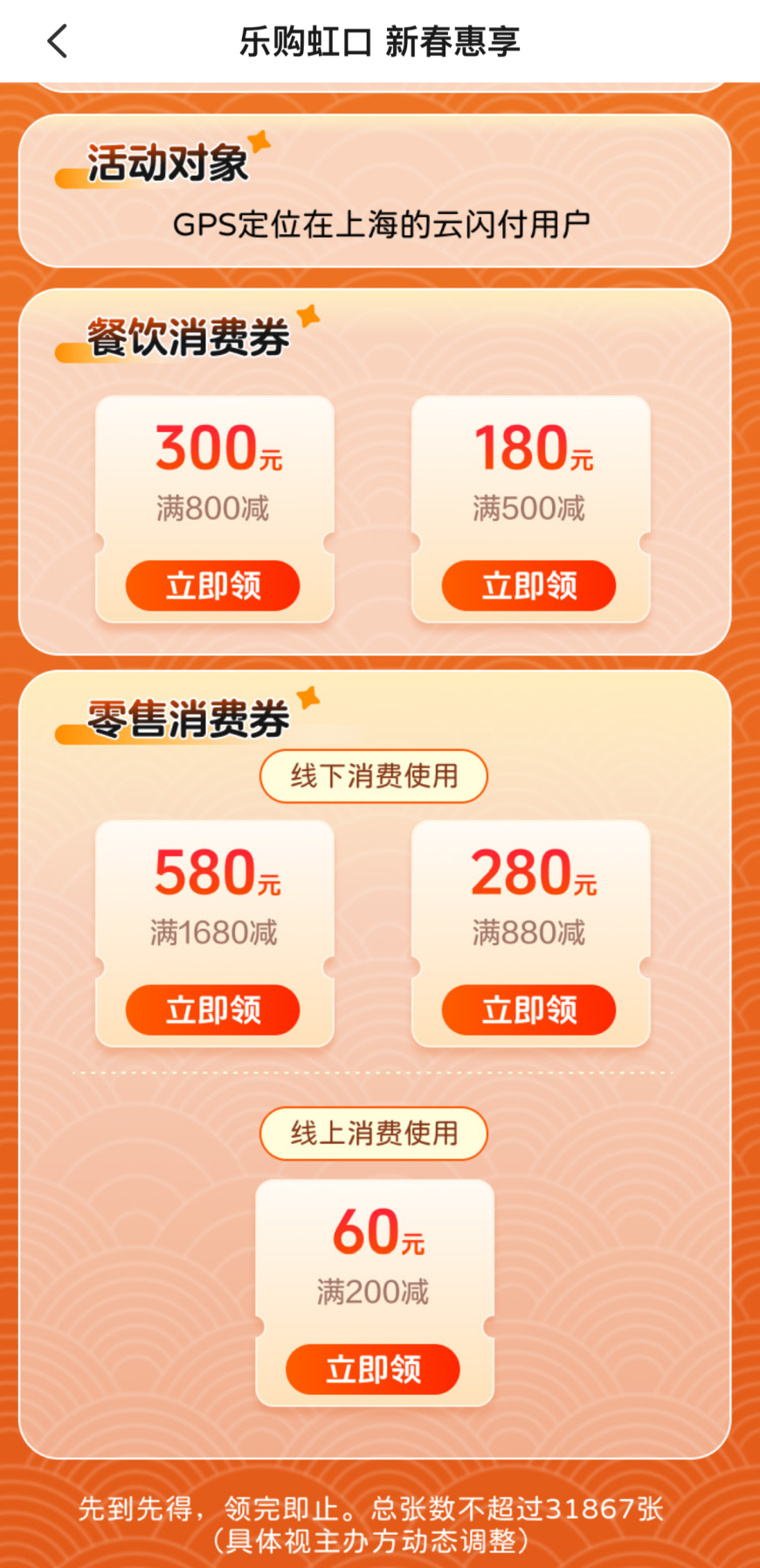 3. 线下券仅适用于虹口区内指定零售商户,仅限到店通过云闪付App被扫支付(商户扫用户码)时抵扣使用。