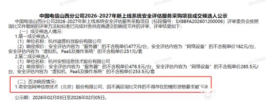 2月3日,中国电信某省公司2026年网络安全技术支撑服务项目(标包一)成交候选人公示,奇安信网神因“不满足询比文件的供应商不得存在下列情形之资格要求被否决”。