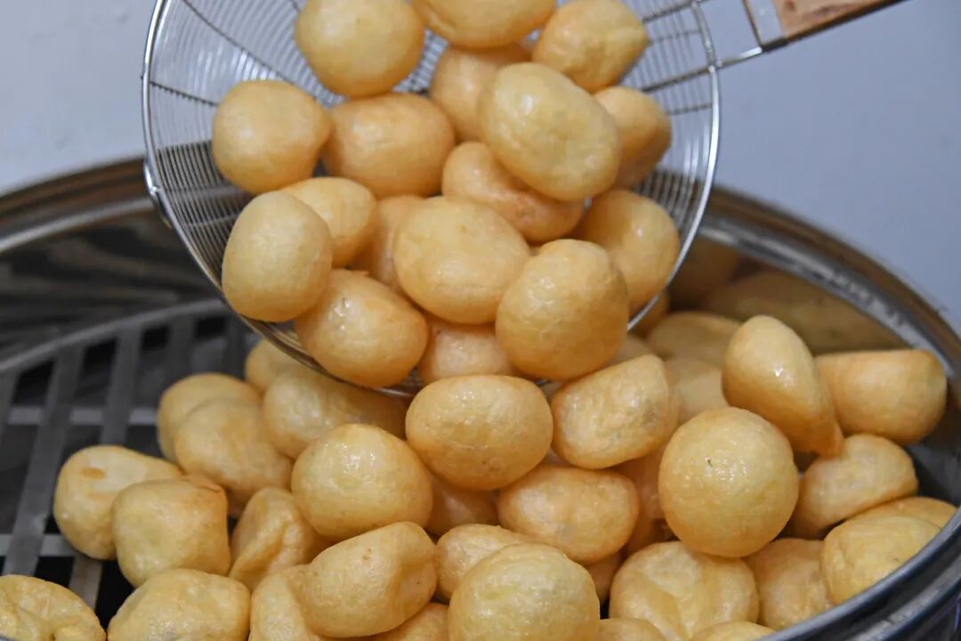罗定皱纱鱼腐起源于元朝大德年间,明清时期便已享有盛誉,距今已有700多年历史。这道长盛不衰的地方风味小吃,金黄圆润,薄如轻纱,香醇诱人,加之“鱼腐”与“愈富”读音相像,成为罗定及其周边一带地区深受欢迎的美味。现如今,这一颗颗圆润的“小个头”不仅凭实力拿下“云浮十大金牌名菜”“国家地理标志产品”等硬核认证,也凭借代代相传的手工技艺,成为罗定重要的产业支柱。