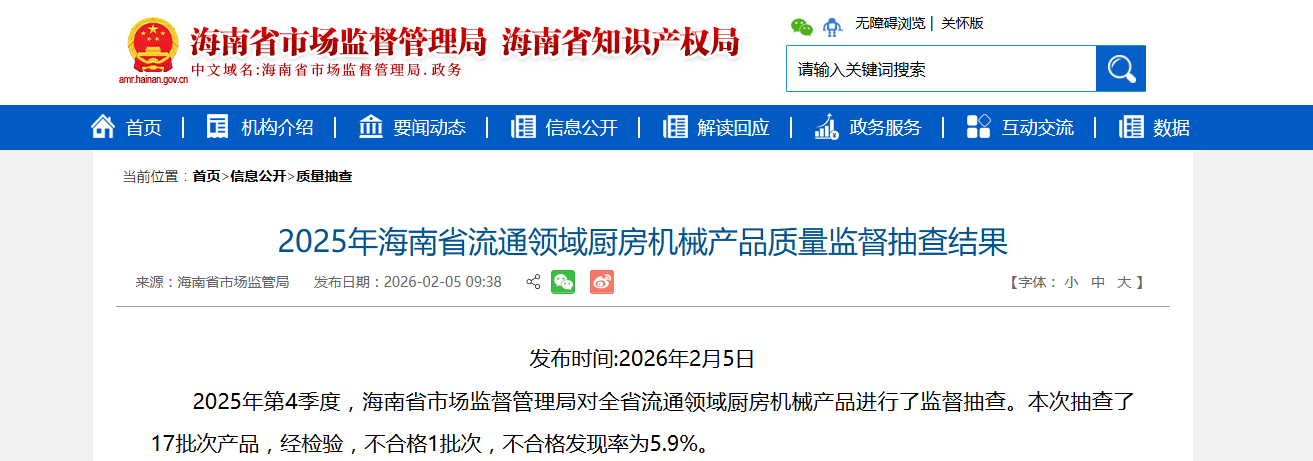 2025年第4季度,海南省市场监督管理局对全省流通领域厨房机械产品进行了监督抽查。本次抽查了17批次产品,经检验,不合格1批次,不合格发现率为5.9%。