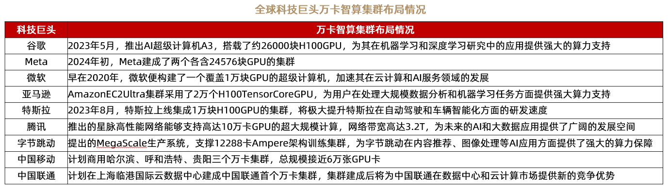 科技巨头加速布局万卡算力集群。基于人工智能的广阔前景,全球科技巨头纷纷加大对AI基础设施布局以维持行业竞争力,其高额资本支出为万卡、十万卡集群建设奠定了基础。根据中国信通院&浪潮信息报告,国际上,Meta(META.US)、微软(MSFT.US)&OpenAI等多家AI巨头陆续宣布或者完成10万卡集群建设,国内通信运营商、头部互联网、大型AI研发企业等均发力超万卡集群的布局。