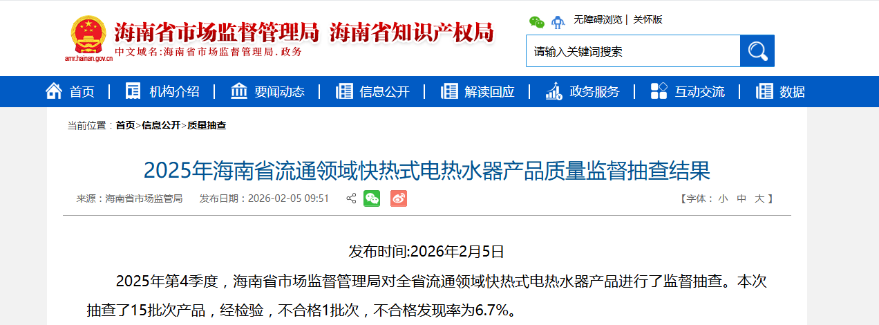 2025年第4季度,海南省市场监督管理局对全省流通领域快热式电热水器产品进行了监督抽查。本次抽查了15批次产品,经检验,不合格1批次,不合格发现率为6.7%。