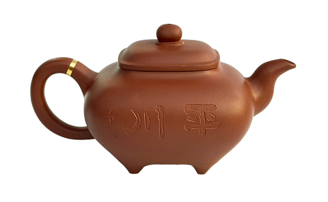 朵云轩展出的《平川》传炉壶,壶身同样一面刻有杨正新先生的《马》图,另一面则由丁申阳以隶书题写“平川”二字。隶书笔法厚重平衡,骨力内蕴,与传炉壶方中带圆的稳重器型形成了精神上的共鸣。更匠心独运之处,在于壶把以24K纯金镶嵌,由国家一级技师熊景精心装饰。一泓暗沉的紫砂上,蓦地跳脱出一道璀璨金光,仿佛平川落日,熔金万里,瞬间点亮了整个器物的精气神。