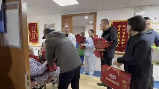 慰问团队又驱车来到上海通大中医医院四楼“优抚病区”,对11名入住“优抚病区”的退役军人进行走访慰问。在走访慰问中,1955年入伍,1981年转业,今年91岁的退役军人张锡虎激动地说:“谢谢各位领导对我们的记挂,专程到‘优抚病区’来慰问我们这些入住的退役军人,心里感到特别的温暖,感谢党和政府对我们的关爱和关心,也祝各位领导工作顺利,新春愉快”。慰问团队的相关部门领导,希望在中西医服务中加强中医康复理疗,缓解老兵年老多病的不适,使他们得到更好的康复治疗和服务,并祝他们新春快乐,健康长寿。