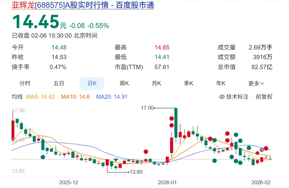 截至2月6日收盘,亚辉龙报收于14.45元/股,股价下降0.55%,总市值82.57亿元。