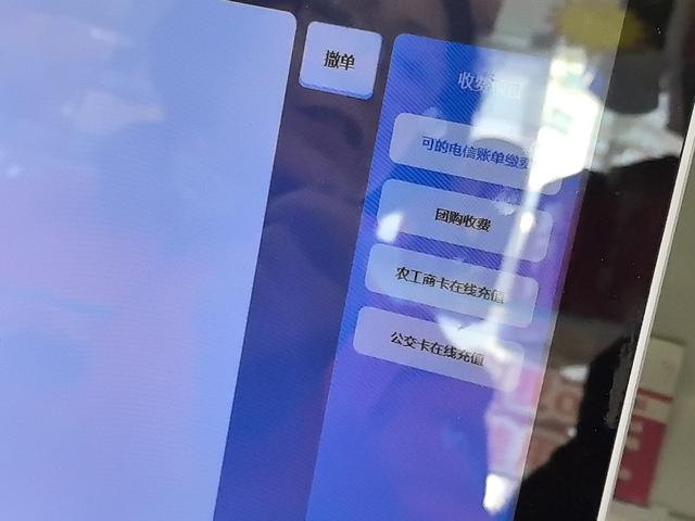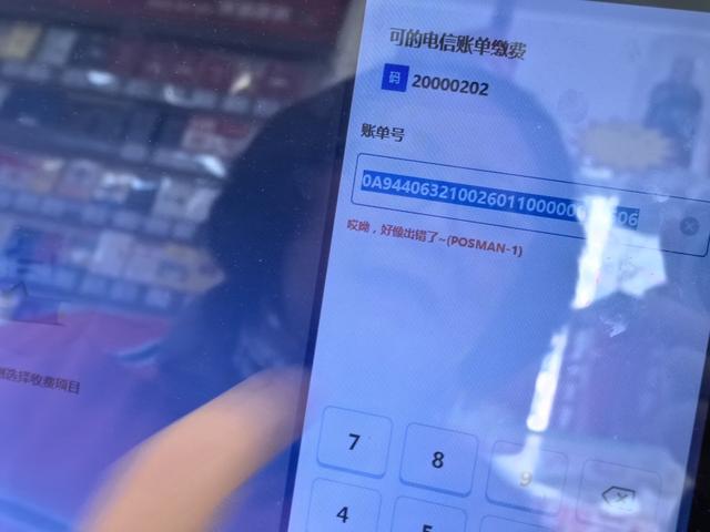 为了让记者信服,收银员现场做了演示。她先在触屏界面上选择“收费”,界面右侧罗列出了4类收费项目。记者细看,其中并无水电煤账单收费项目,相近的仅有“电信账单缴费”。收银员点击“电信账单缴费”后,再用POS机扫描记者手里的账单,页面上提示“哎呦,好像出错了”,未能识别账单类型和金额,只能作罢。