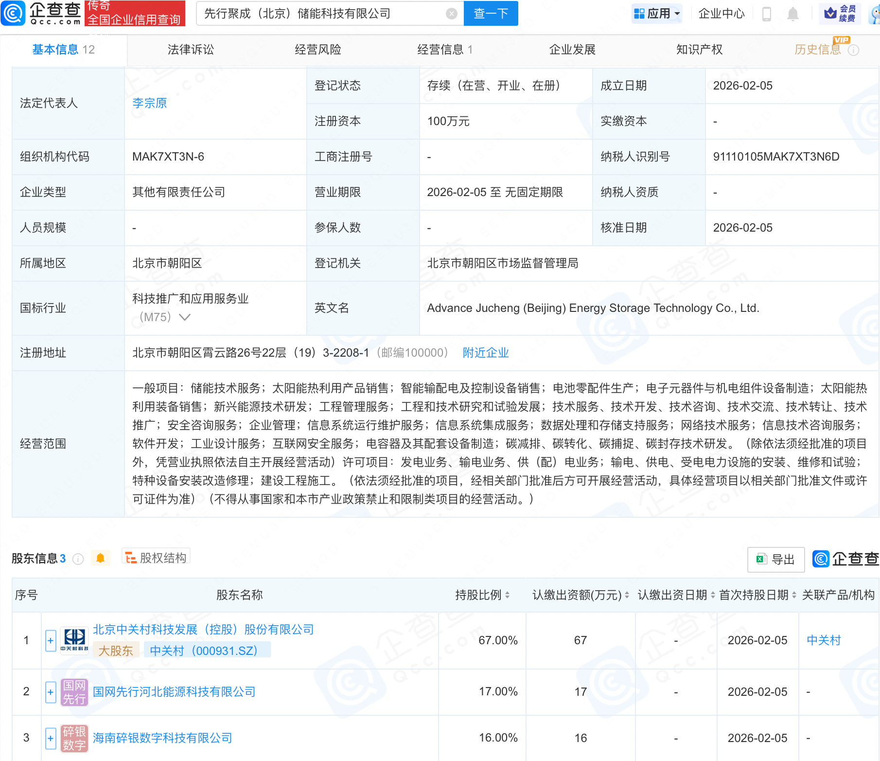 企查查APP显示,近日,先行聚成(北京)储能科技有限公司成立,经营范围包含:储能技术服务;太阳能热利用产品销售;智能输配电及控制设备销售;电池零配件生产等。企查查股权穿透显示,该公司由中关村(000931.SZ)等共同持股。