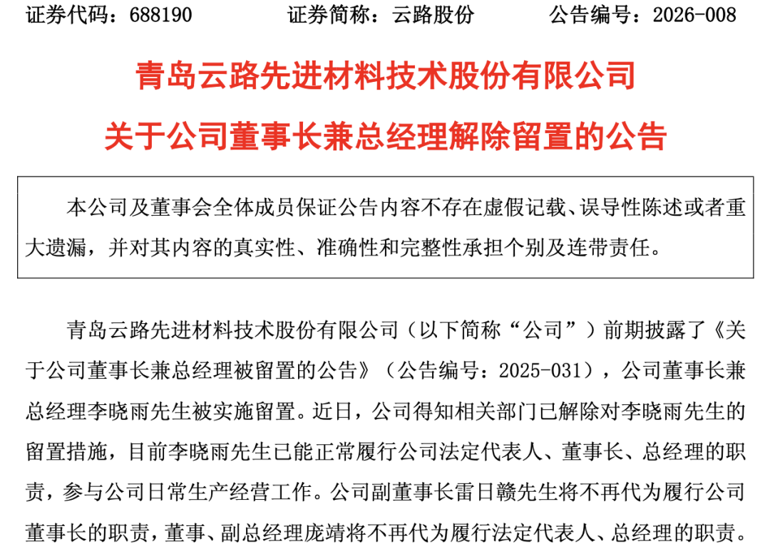 2月8日,云路股份(688190)公告,近日,公司得知相关部门已解除对李晓雨的留置措施,目前李晓雨已能正常履行公司法定代表人、董事长、总经理的职责,参与公司日常生产经营工作。