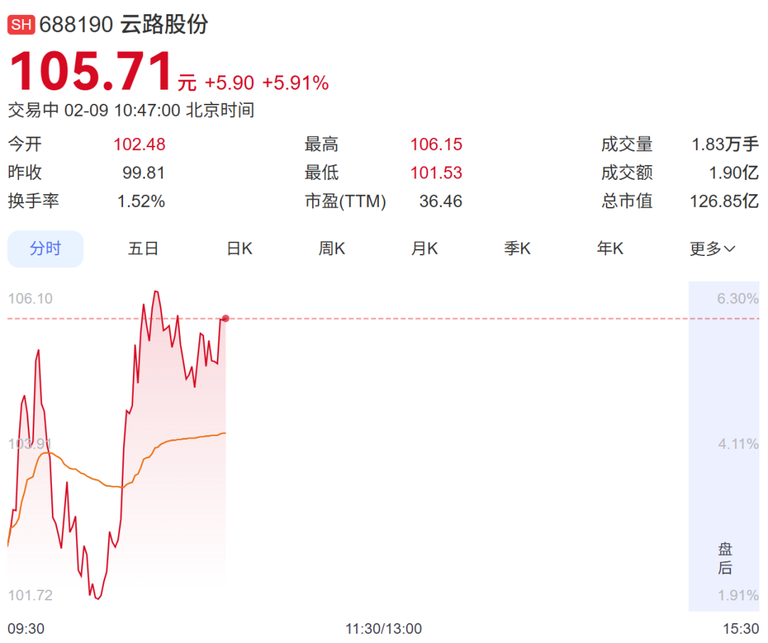 从股价情况来看,李晓雨被留置消息发布后,云路股份股价短暂下跌后曾走出一波上涨行情。2025年10月15日一度涨到了131.42元/股,截至2月9日发稿为105.71元/股,总市值126.85亿元。