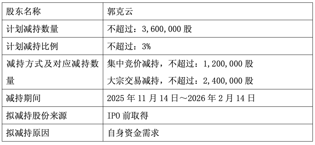 公告显示,郭克云通过集中竞价方式及大宗交易方式减持其所持有的公司股份不超过360万股,即不超过公司总股本的3%。减持期间自公告披露之日起15个交易日后的三个月内进行,减持价格按市场价格确定。
