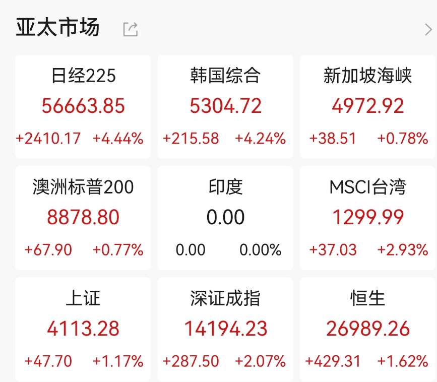 2月9日上午,亚太市场普遍活跃:日韩股市双双大涨,恒生指数、澳洲标普200指数亦有一定涨幅。