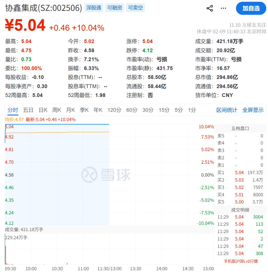 协鑫集成走出4连板,截至午间收盘,成交量近21亿元,买一超197万手。
