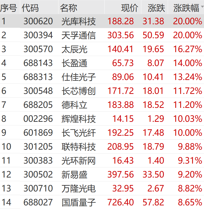 个股方面,光库科技、天孚通信20cm涨停,长飞光纤、辉煌科技涨停,太辰光、德科立、长芯博创、新易盛、国盾量子等集体大涨。