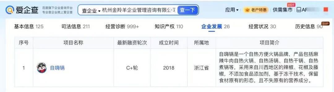 企业品牌项目信息显示,自嗨锅成立于2018年,是一个自热方便火锅品牌,产品包括麻辣牛肉自热火锅、自热汤锅、自热干锅、自热煮锅等。