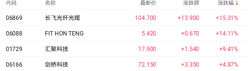截至收盘,长飞光纤光缆(06869.HK)涨15.31%、汇聚科技(01729.HK)涨9.41%、剑桥科技(06166.HK)涨4.87%。