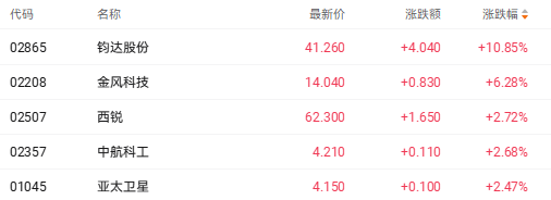 截至收盘,钧达股份(02865.HK)涨10.85%、中航科工(02357.HK)涨2.68%、亚太卫星(01045.HK)涨2.47%。