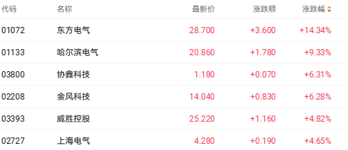 截至收盘,东方电气(01072.HK)涨14.34%、哈尔滨电气(01133.HK)涨9.33%、金风科技(02208.HK)涨6.28%。