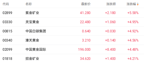 截至收盘,紫金矿业(02899.HK)涨5.58%、灵宝黄金(03330.HK)涨4.95%、中国黄金国际(02099.HK)涨4.48%。