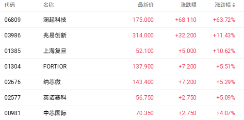 截至收盘,澜起科技(06809.HK)涨63.72%、兆易创新(03986.HK)涨11.43%、上海复旦(01385.HK)涨10.62%。