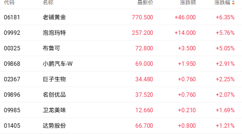 新消费再获资金关注 老铺黄金涨超6%